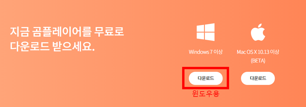 ① 위에 올려드린 링크를 타고 들어가서 곰플레이어 설치파일을 다운로드 합니다. 윈도우용과 맥용을 별도로 지원합니다. 윈도우용으로 설치해보겠습니다.