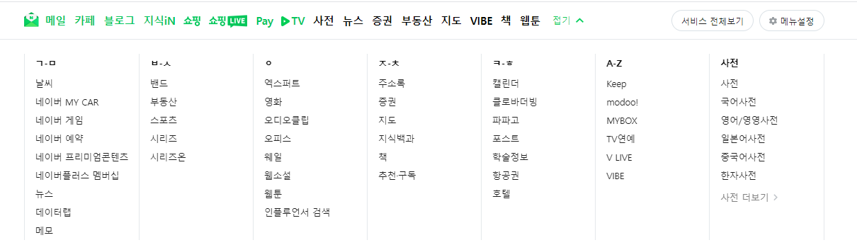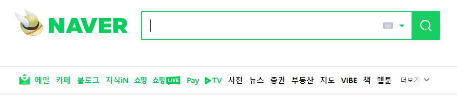 살펴보면 통합검색부터 사전, 지식인, 쇼핑, 웹문서, 네이버 웹툰, 동영상 등의 서비스를 제공하고 있습니다.
