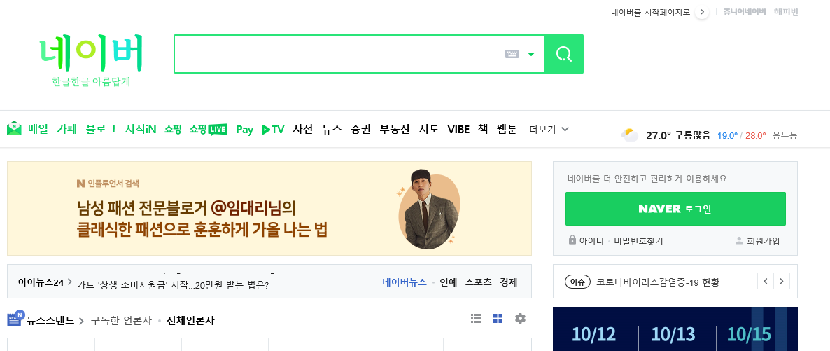 우리가 잘 아는 네이버는 일반 통합 서비스 뿐만 아니라 다양한 분야의 통합 서비스를 제공하는 인터넷 포털입니다.