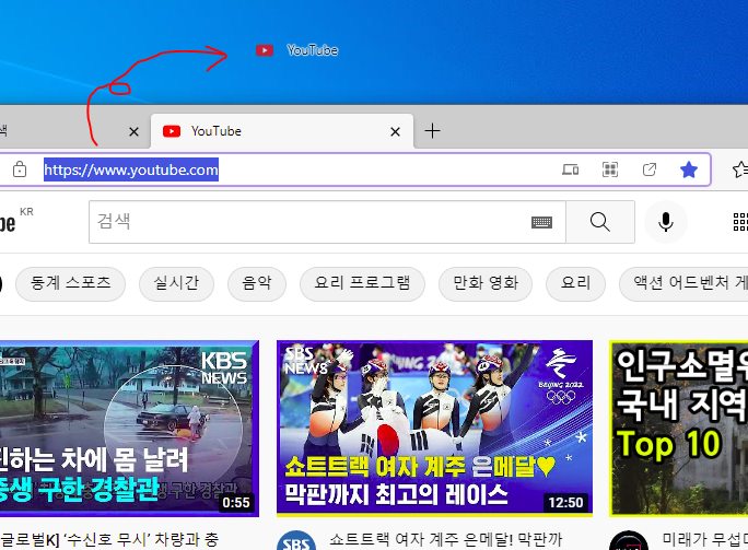 마이크로소프트 에지, 익스플로러나 크롬 등 어떤 브라우저를 사용하더라도 모두 똑같은 방법이면 유튜브 바로가기를 만들 수 있습니다. 그것은 바로 마우스로 클릭과 드래그만 할 수 있으면 됩니다. 마이크로소프트 에지 화면에서 보여드리겠습니다.